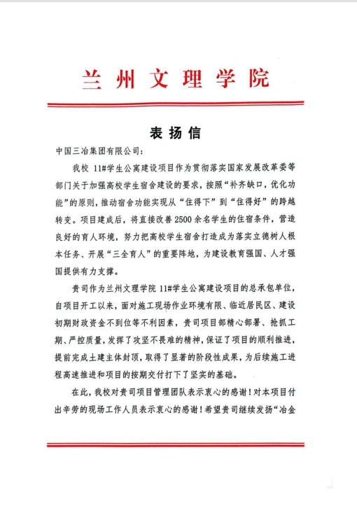 信中說,自項(xiàng)目開工以來,面對施工現(xiàn)場臨近居民區(qū)、作業(yè)環(huán)境受限、建設(shè)初期資金緊張等不利因素,項(xiàng)目部精心部署、搶抓工期、嚴(yán)控質(zhì)量,發(fā)揮了攻堅(jiān)不畏難的精神,保證了項(xiàng)目的順利推進(jìn),提前完成土建主體封頂,取得了顯著的階段性成果,為后續(xù)施工進(jìn)程高速推進(jìn)和項(xiàng)目的按期交付打下了堅(jiān)實(shí)的基礎(chǔ)。學(xué)院對中國三冶全體工作人員表示衷心感謝,希望繼續(xù)發(fā)揚(yáng)“冶金建設(shè)國家隊(duì)”的優(yōu)良作風(fēng),再接再厲,以更高的標(biāo)準(zhǔn)、更嚴(yán)的要求、更實(shí)的作風(fēng),將該項(xiàng)目打造成一個(gè)質(zhì)量過硬、環(huán)境優(yōu)美、設(shè)施完善、學(xué)生滿意的精品工程、標(biāo)桿工程。
